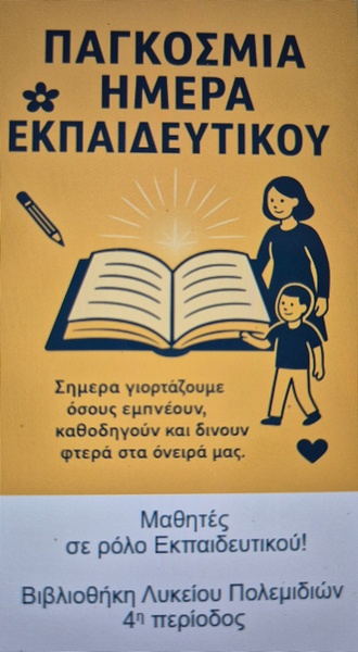 Τη Δευτέρα, 6 Οκτωβρίου 2025, με αφορμή την Παγκόσμια Ημέρα Εκπαιδευτικών (5 Οκτωβρίου), η Επιτροπή Βιβλιοθήκης του Λυκείου Πολεμιδιών οργάνωσε δράση με σκοπό να τιμήσει τον καθοριστικό ρόλο των εκπαιδευτικών στην εκπαίδευση και στην κοινωνία.